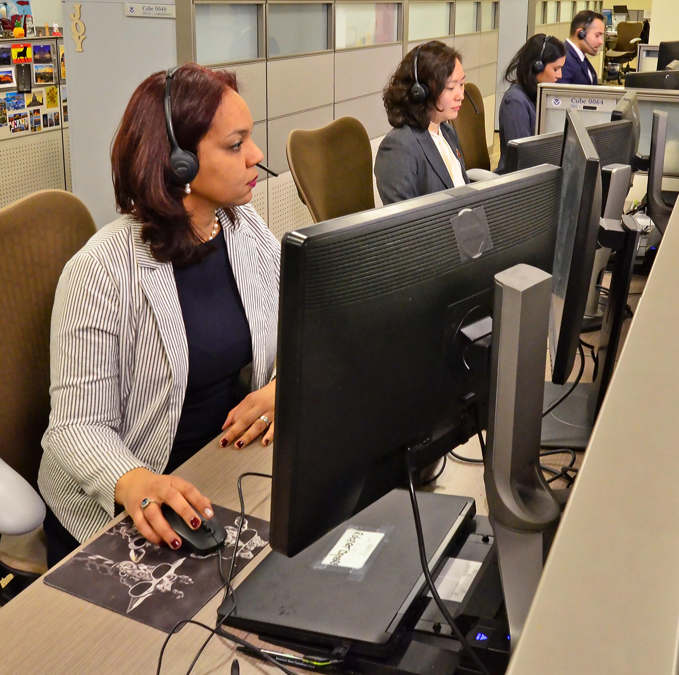 Empleados de USCIS hablan con clientes por teléfono en el Centro de Contacto