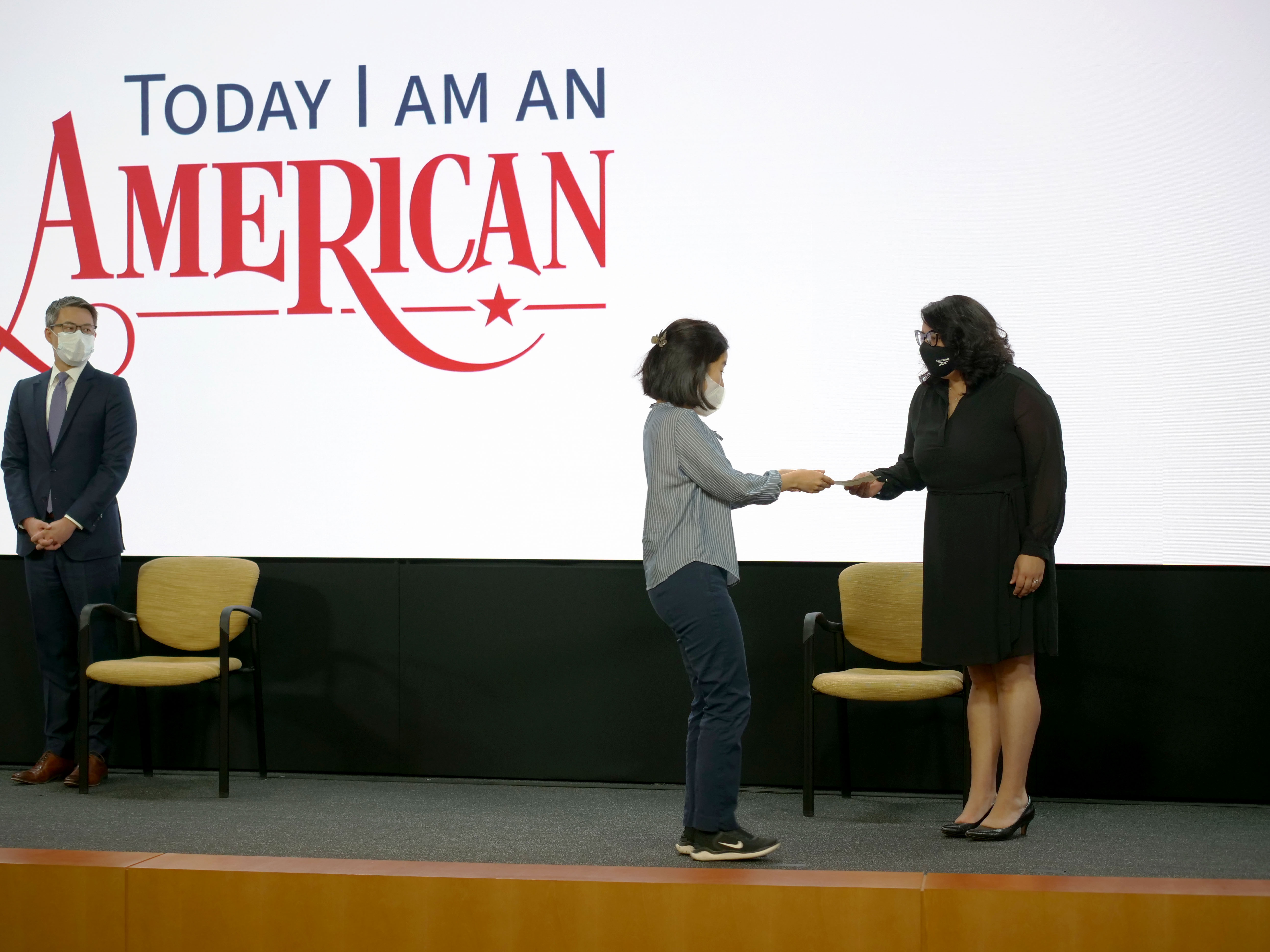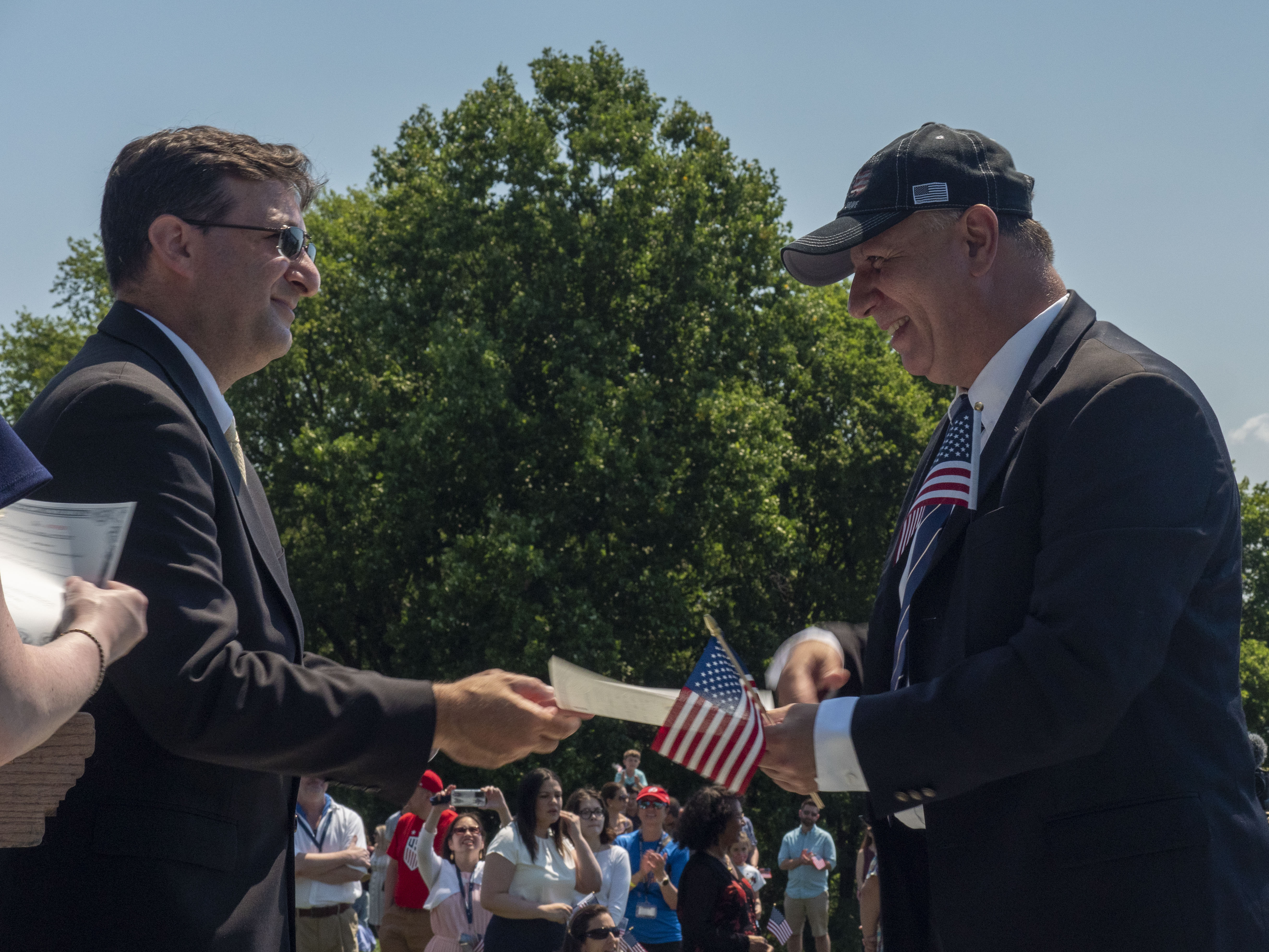 Funcionario de USCIS le entrega el certificado de naturalización a un nuevo ciudadano en Mount Vernon