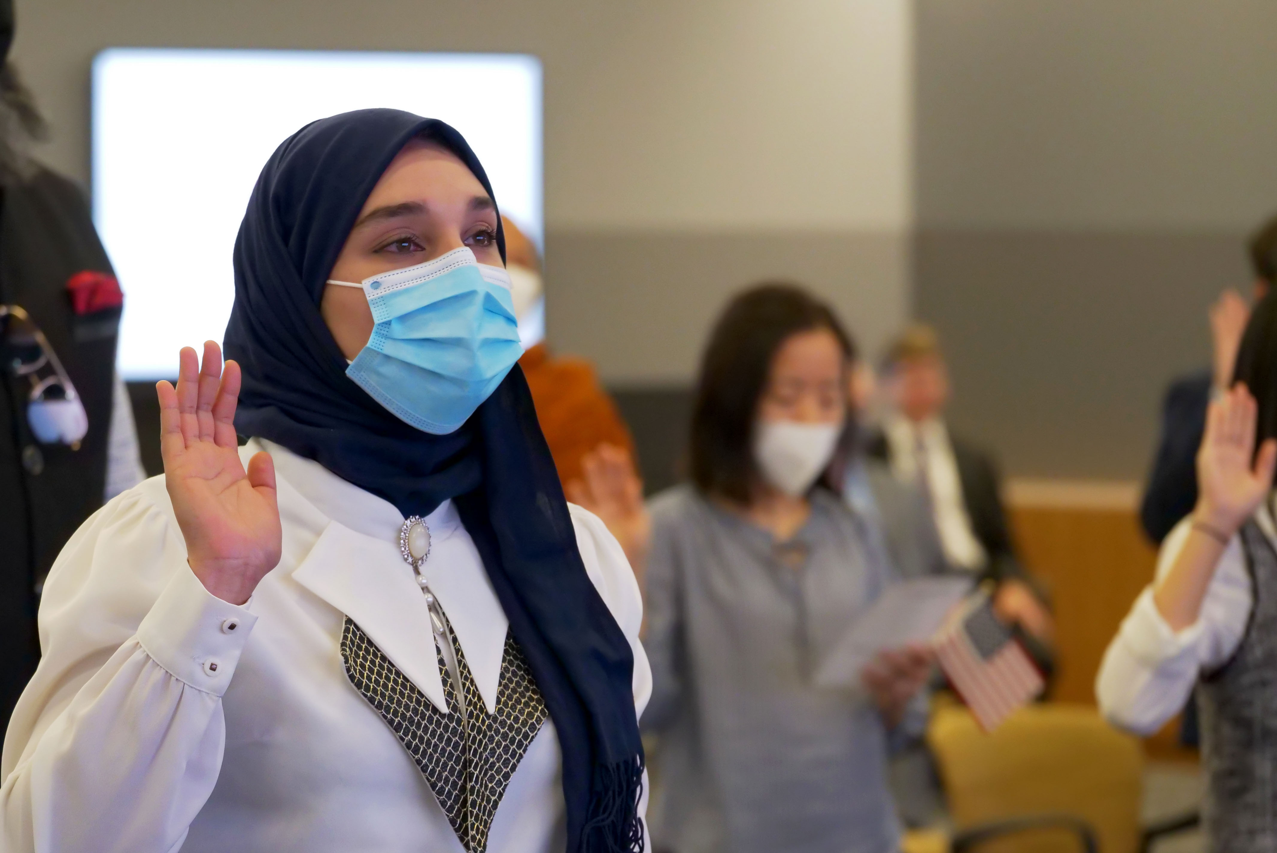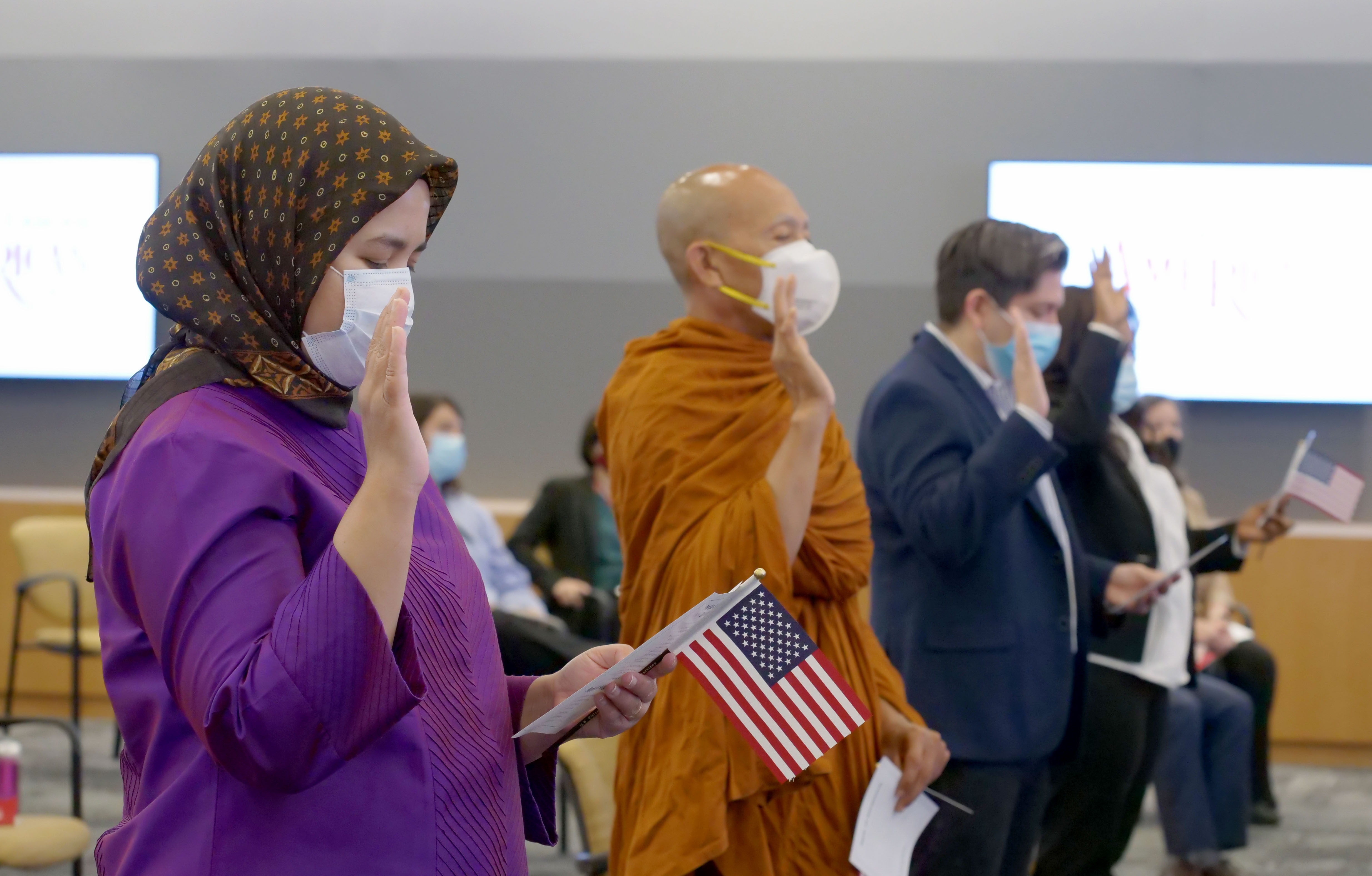Prestando el Juramento de Lealtad para convertirse en ciudadanos en las oficinas centrales de USCIS